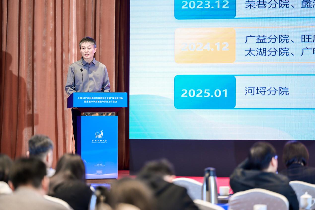 江苏开放大学社会教育处处长、老年发展学院副院长孙旭作了题为《筑牢中国式现代化银龄基石,赋能老年友好社会新生态》的工作报告。孙旭在报告中全面回顾了学校老年教育的成绩单和问题墙,并提出了“十五五”期间将聚焦“协同扩容”,构建跨界融合的“老年教育生态圈”;“内涵提质”,锻造精准供给的“老年教育金课堂”;“模式创新”,开辟赋能成长的“老年教育新赛道”;“机制护航”,筑牢长效发展的“老年教育制度基础”;“研标引领”,树立事业发展的“老年教育智囊旗”方面实施五大“攻坚突破”行动。