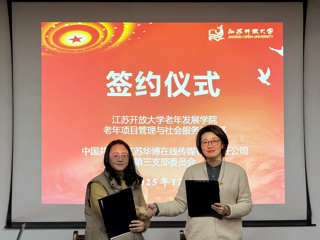 活动伊始,老年发展学院老年项目管理与社会服务党支部与江苏华博在线传媒有限责任公司第三党支部共同签署了《党建共建协议》,协议以“资源共享、优势互补、注重实效、共同提高”为原则,确立了结对共建的正式合作关系,标志着校企协同联动开启了新篇章。